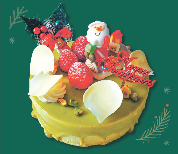 ピスタチオブリュレとベリーソースをピスタチオのムースで包み、グラサージュでコーティングしました。ひと口でピスタチオの濃厚な味わいが広がり、ベリーの甘酸っぱい余韻が残ります。