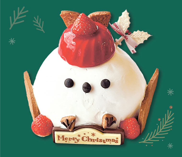 生クリームを美しく塗り上げたスポンジ生地のまんまるボディの中には、ホワイトチョコムースと苺ムース入り。赤い帽子はラズベリームースです。今年はエゾモモンガもあるよ。