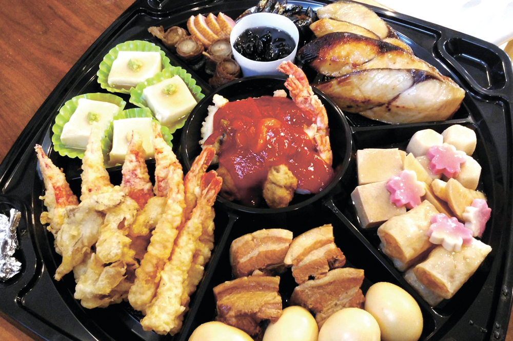 豚角煮、胡麻豆腐、胡麻、天ぷら、目鯛西京焼き、エビチリ、黒豆ほか。仕入れ状況により内容が変更になる可能性あり。