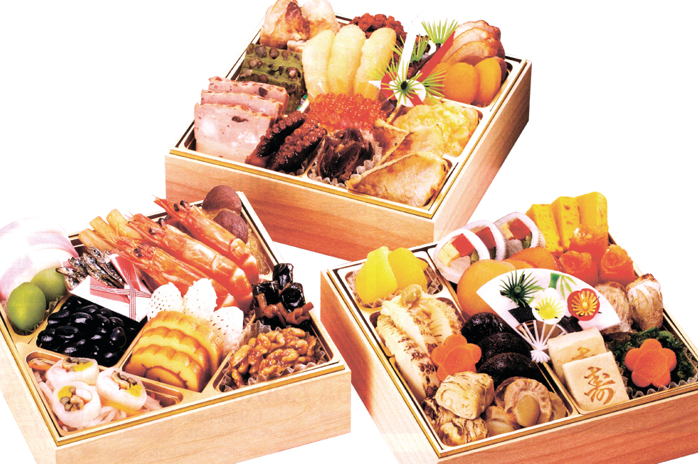 伝統の味を豊富に盛り込んだ三段重。山海の恵みをふんだんに使い40品のメニューが味わえます。定番料理を豊富に使った27品一段重6,480円もあり。旭川市内全域無料で宅配します。