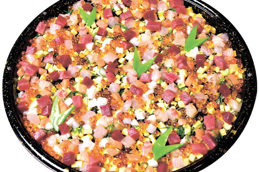 まぐろ、エビ、サーモン、カンパチ、ホタテ、いくら6種のネタを盛り込みました