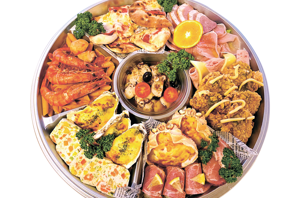 大きめ海老と渡り蟹のトマトクリームペンネ、タコのアンチョビマリネ、生ハムと鴨のスモーク、グラタン2種、もともちピッツァ、ポテト、若鶏の柔らかフリットチーズがけ、テリーヌ他