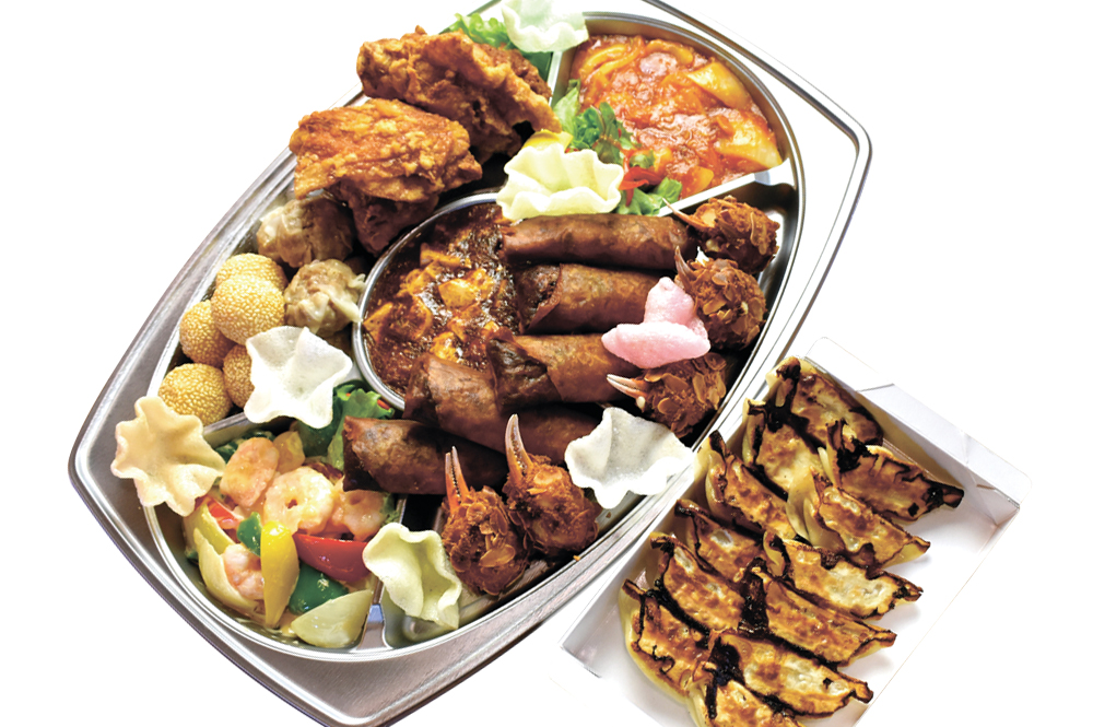 麻婆豆腐、エビチリ、エビマヨ、春巻、餃子、肉焼売、胡麻団子、カニ爪、ジャンボ唐揚げ