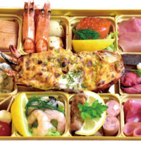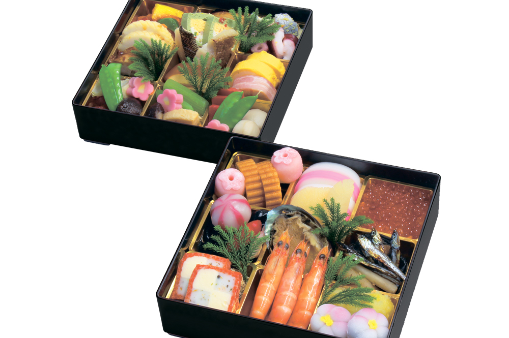 【壱の重】伊達巻き、ねり切梅、紅白蒲鉾、数の子、いくら、なます漬、手まり餅、黒豆、千代呂木、煮鮑ほか