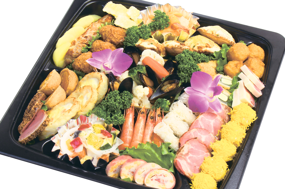 【弐の重】鳥賊巻、チキンロール、鰊菜の花漬、酢蛸、帆立姿煮、海老チリソース、鮎並白醤油焼きほか