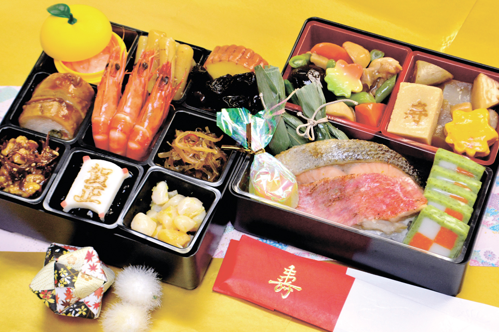1日6000食の給食をつくる専属の管理栄養士と調理士が栄養バランスを考えながら作る与段重。定番のおせち料理から子どもたちが喜ぶスイーツや旭川の老舗北かりの丸福ドーナッツなどの和洋菓子を詰めたお重まで、三世代で楽しめる多彩な品をぎゅっと盛り込みました。エネルギーや塩分量を表記しているから食事制限のある人も安心して食べられます。家族みんなで迎える新年の祝いにふさわしい豪華なおせちです。