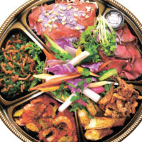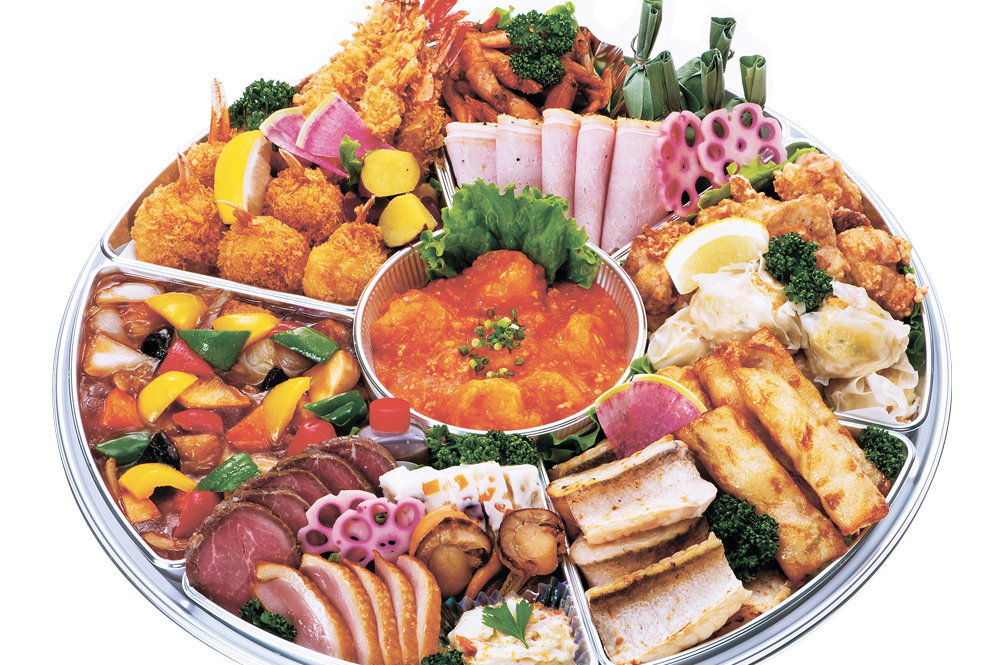 ブラックタイガー海老チリ、オホーツク北斗ポーク黒酢酢豚、牛ヒレステーキ、鴨スモーク、シーサラダ、帆立照り焼き、フルーツメゾンテリーヌ、白甘鯛西京焼き、海老湯葉巻き、蟹しゅうまい、伊達産鯉寿し特製ザンギローストポーク、海老唐揚げ、笹団子、ブラックタイガー海老フライ、蟹クリームコロッケ、さつま芋甘露煮、花ちらし蓮根