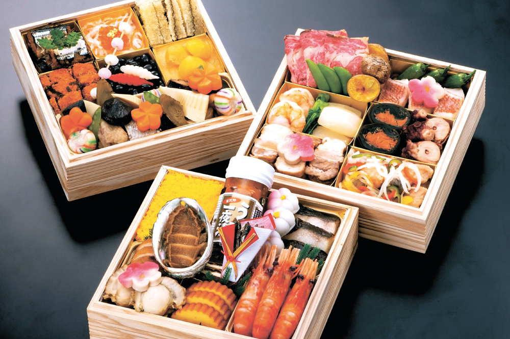 【一の重】吹き寄せ玉子、雄武産うに一夜漬、華梅、銀鱈西京焼き、伊達産鶏野菜巻き、噴火湾産帆立旨煮、鮑旨煮、柿博多、伊達巻、田作り、牡丹海老塩煮、梅麩