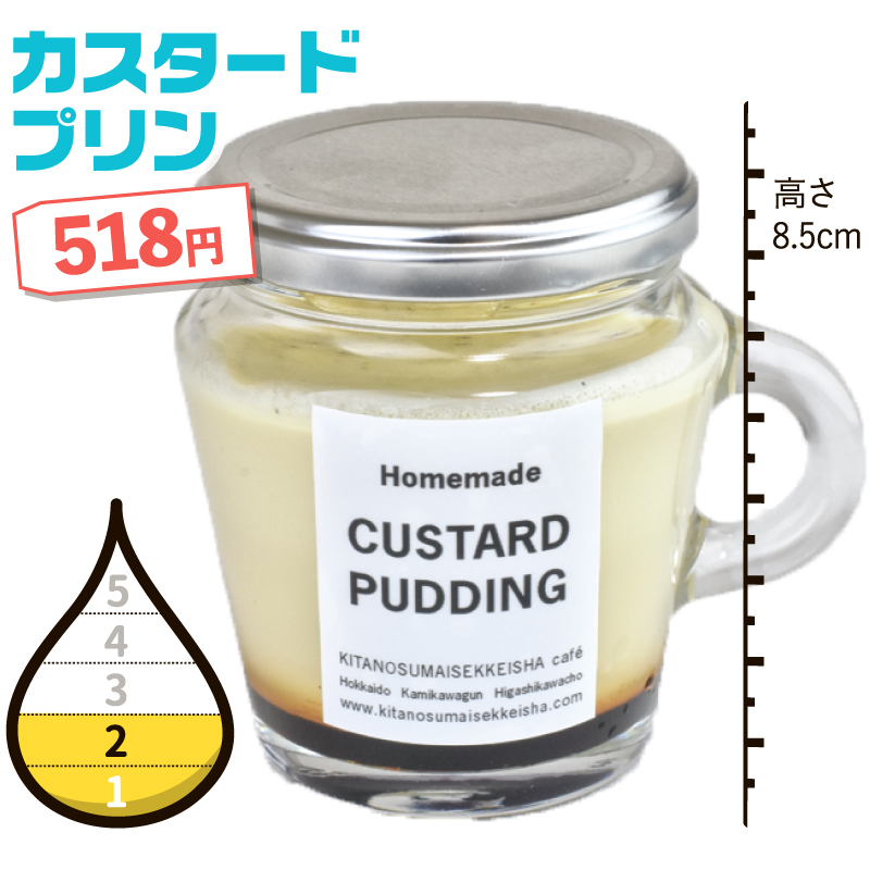 東川ファームレラの大雪なたまご、旭川クリーマリー農夢の生クリームとノンホモ牛乳を使用。生地が二層に分かれ、上下違った食感になる。量はなかなかたっぷりめ。