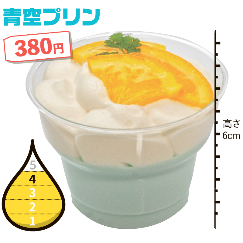 青空をイメージし、色合いのインパクト大。ちなみにオレンジは太陽で生クリームは雲。ブルーリキュールを使用したレモンミルク味で、すっきりとした爽やかな味わいだ。
