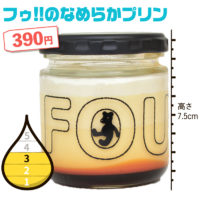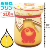 平飼い自然卵と低温殺菌乳、生クリーム、甜菜含蜜糖を使用した、バニラ風味のプリンに、カラメル風味のわらび餅をのせてある。わらび餅のもっちり食感がクセになる。