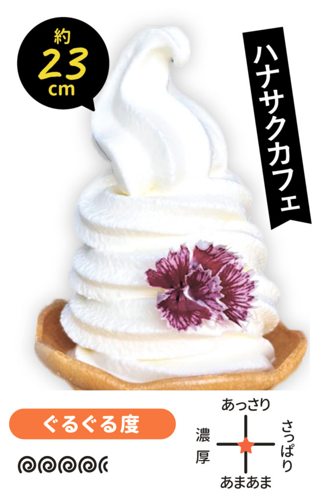 ソフトもハナサク♪新鮮な道産ミルクを練り上げ、エディブルフラワーをあしらったキュートな1本。お花は季節ごとに変わるので、何度も通ってみて。ちびっこも食べやすいカップに変更できるほか、ミニ(350円)もあり。