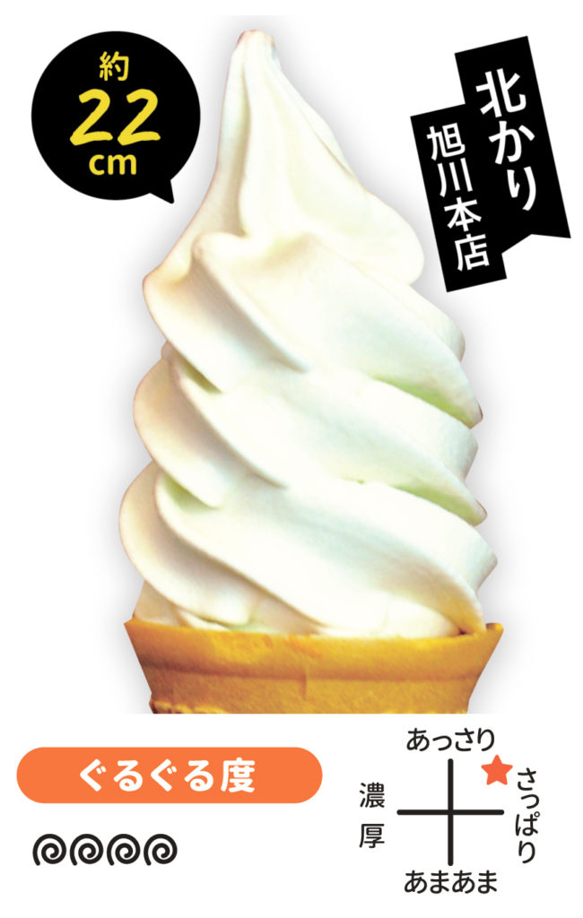 江丹別町・伊勢ファームから直送した搾りたての生乳を使用。乳化安定剤を使わず、無添加・無着色で丁寧に仕上げた優しい味わいのソフトです。きなこ黒蜜やチョコソースもあり。カップは400円。