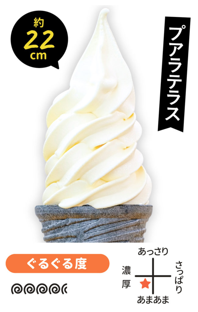 インド洋に浮かぶレユニオン島産バニラと道産生クリーム、国産卵黄で作る、すっきりした甘さのソフト。程よく香るバニラの風味がリッチで、天然炭を練り込んだコーンがスタイリッシュ!+100円で塩トリュフソフトに。