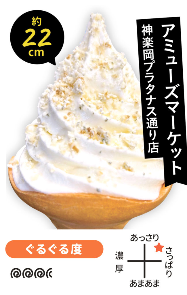 砂川・岩瀬牧場の低温殺菌されたノンホモ牛乳で作る卵不使用のソフトに、江丹別・伊勢ファームの青いチーズをトッピング。ブルーチーズの塩気とコクが、予想外の変化をもたらします。トッピングなしは380円。