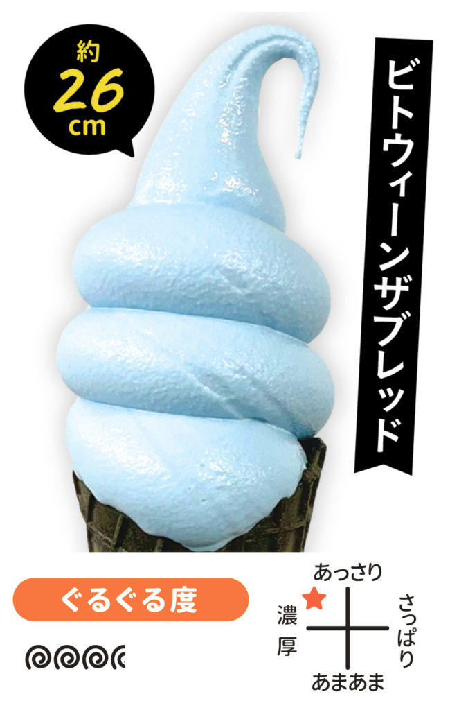 美瑛ファームの3種類の生乳をブレンドしたソフトに、栄養価の高いスーパーフード「スピルリナ」を混ぜ込んでいます。美瑛の観光名所・青い池を彷彿とさせる鮮やかな色合いは、スピルリナの色素による天然由来です。