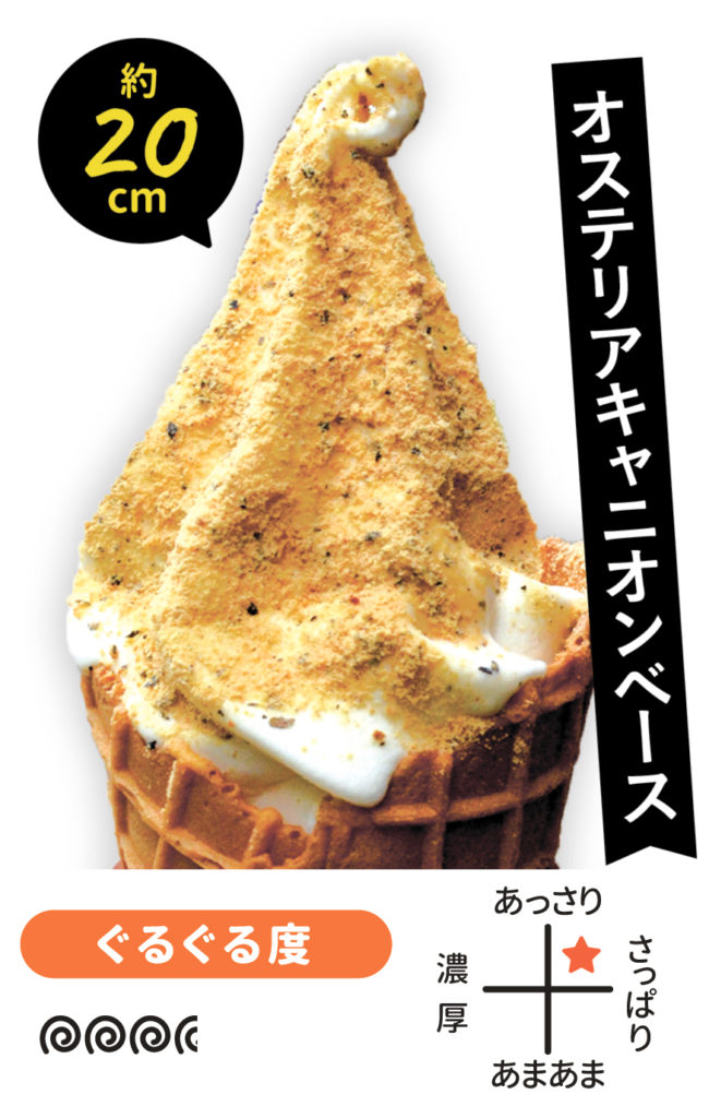 青大豆と黒大豆をあわせたきなこが覆いつくす和風ソフト。毎日その日の牛乳をブレンドして作るフレッシュな味わいに、きなこの香ばしさがマッチします。店内で食事をした方限定で、ノーマルソフトのミニ(200円)も注文可。