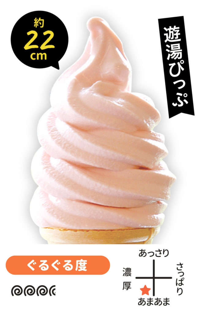 濃厚なミルク感の中に、いちごの甘い香りが広がる、「いちごのまち」ならではの名物ソフト。優しいピンク色にも癒されるぅ。休憩室と売店で20時半まで販売。湯上りの身体をクールダウンして。