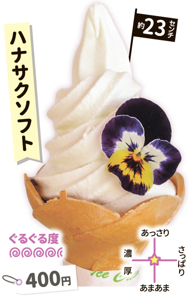 ソフトもハナサク♪道産ミルクを使い、エディブルフラワー(食用花)をあしらったキュートな1本。お花は季節ごとに変わるので何度も通って。