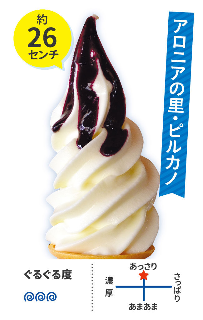 地元・斉藤牧場のソフトクリームに、甘酸っぱ~い自家製のアロニアソースをかけたさわやかな味わい。溶けが早いのは「究極の無添加」である証なのでご了承を。じっくり堪能しつつ、すみやかに召し上がれ。