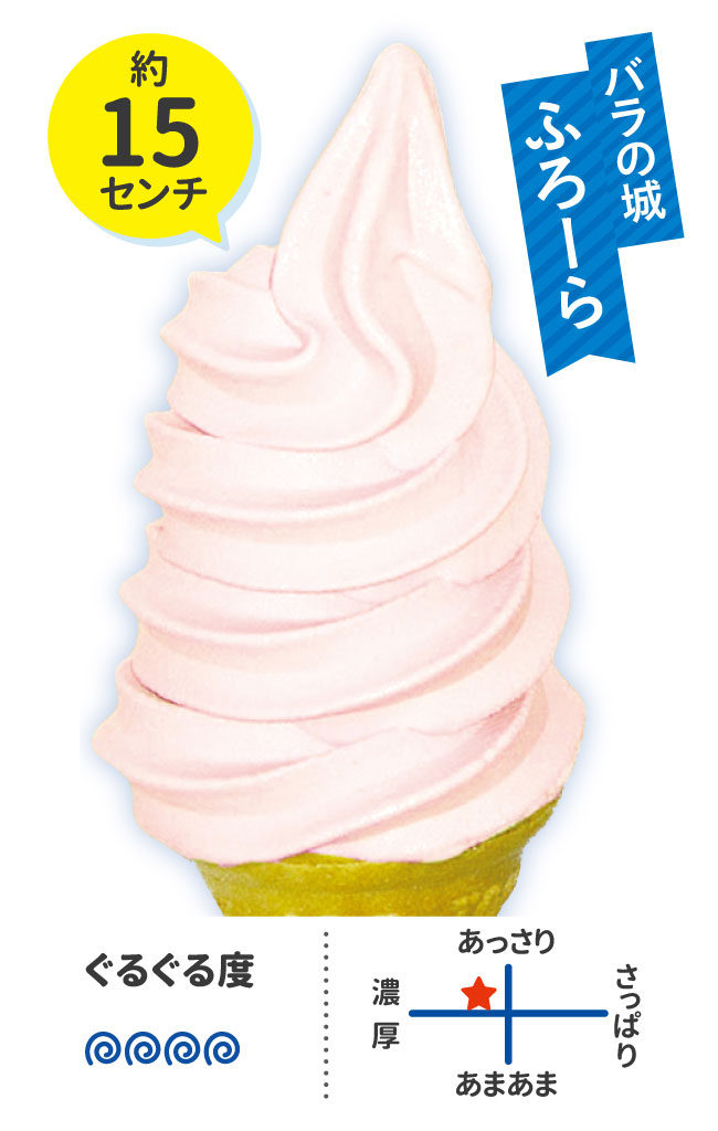 地元の酪農家が作るミルクソフトに、バラのエッセンスをしのばせた芳しい1本。思わずうっとりしてしまうバラの香りを堪能しながら、目の前に広がる3000株のバラを愛でる時間は優雅そのもの♡